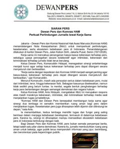 “Kerja sama dengan Komnas HAM dan kepolisian sangat penting agar kasus-kasus kekerasan terhadap pers tidak berhenti di tengah jalan, tetapi benar-benar diselesaikan secara adil,” tegas Komaruddin.