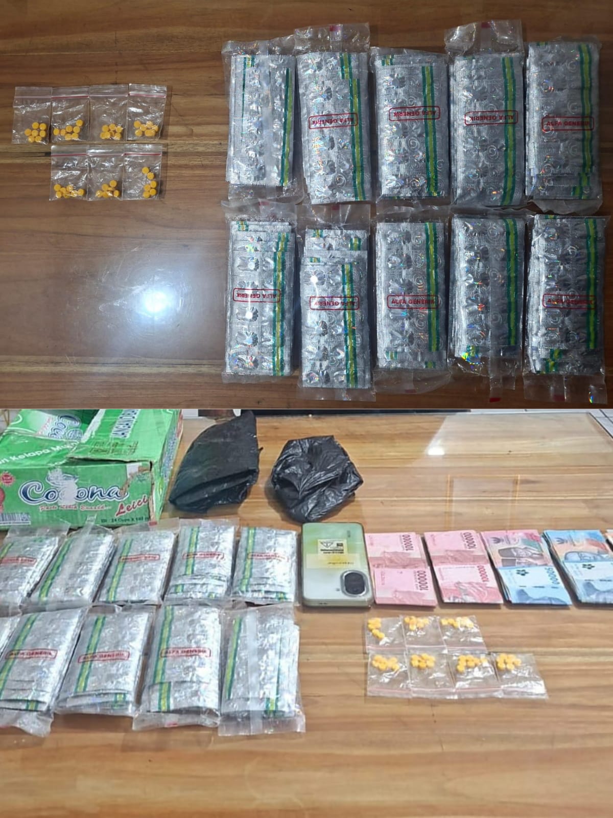 Dalam penggeledahan yang berlangsung dramatis, petugas menemukan “Kardus Maut” tersebut dan berhasil mengamankan barang bukti berupa ​979 Butir Tramadol, ​48 Butir Hexymer,​Uang Tunai Rp 4.409.000 yang diduga hasil penjualan OK, ​2 Unit Handphone, hingga lainnya.